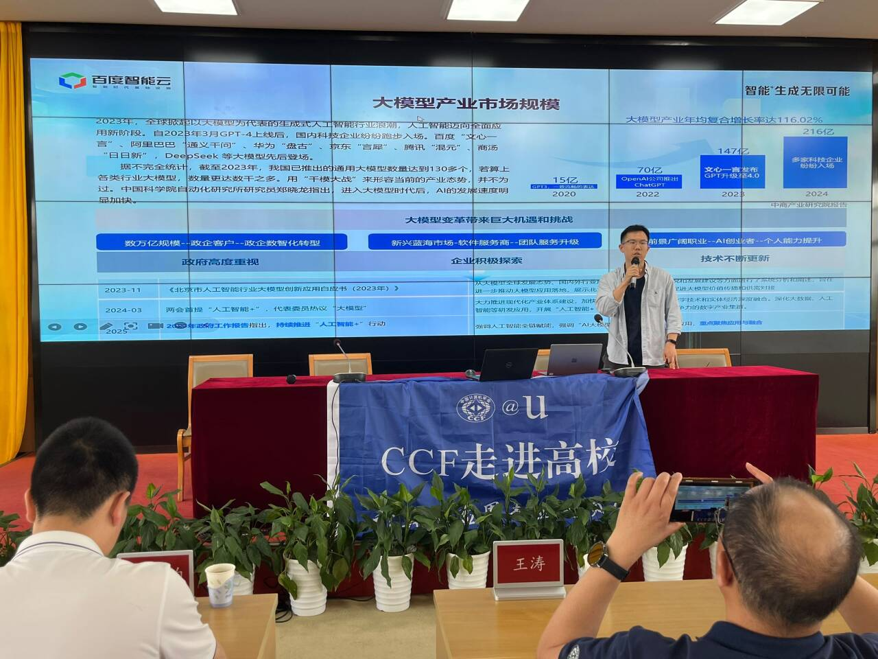 百度智能云的高级解决方案架构师王敏晟架构师围绕“AI大模型及百度智能云工信部大模型认证”展开分享,介绍生成式大模型的基本概念与应用案例,工信部生成式人工智能应用工程师职业技能等级认证,第三届“文新杯”创业大赛等。